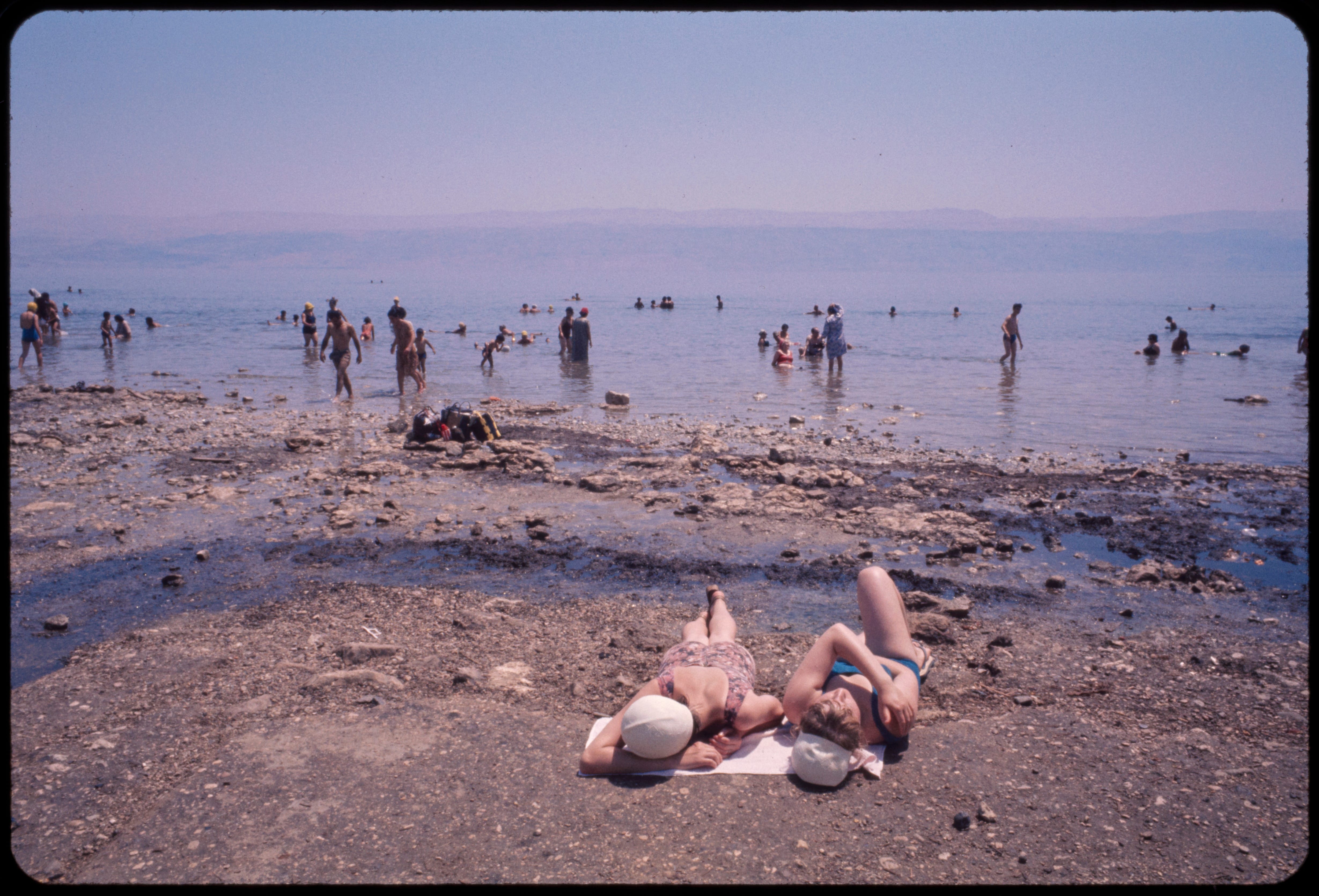 We get to the beach and grab some plastic chairs. Sweat trickles down our bodies. Arlene’s makeup melts. I trace a line of sweat in her makeup, distinguishing her skin tone from the foundation shade she wears. We begin to undress down to our bathing suits. I wish for a breeze to cool the sweat on my body and a breeze does come, but it feels like air from a blow dryer. The murky body of water is outlined by a firm rocky surface and several pockets of mud. From our end of the shore, I spot the Jordanian hills.